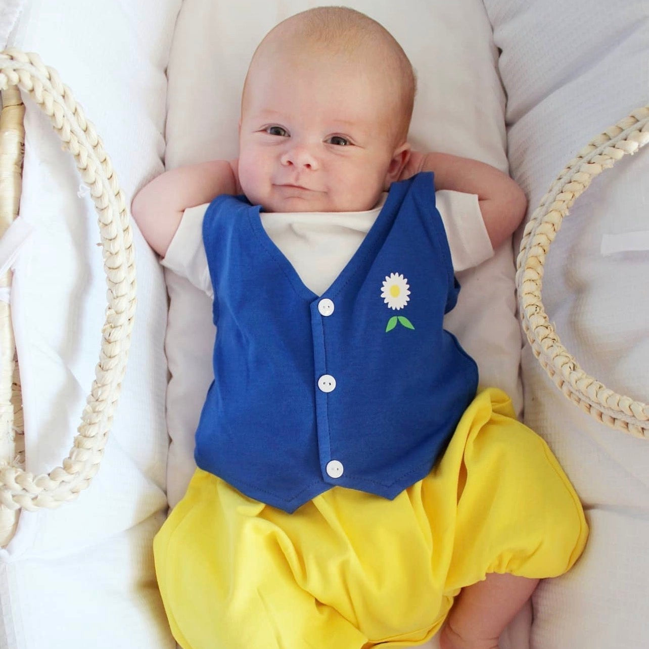The outfit comes in two pieces. A classic romper paired with a vest, creating the original look while remaining comfortable and practical for everyday baby life. The signature look and traditional color palette capture the spirit of Swedish heritage, while the soft cotton ensures that little explorers can move freely.