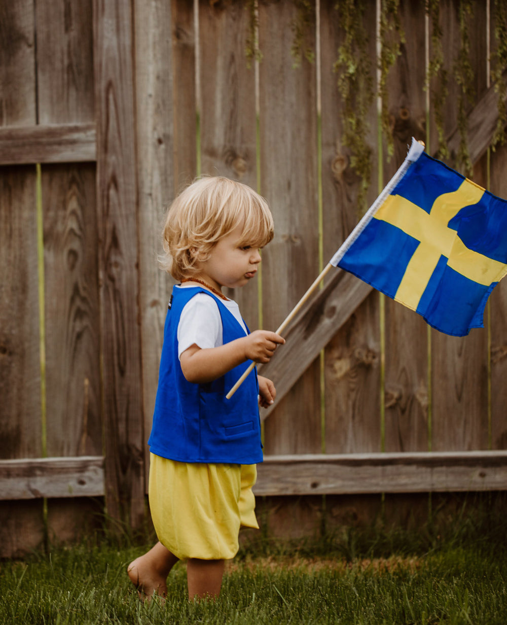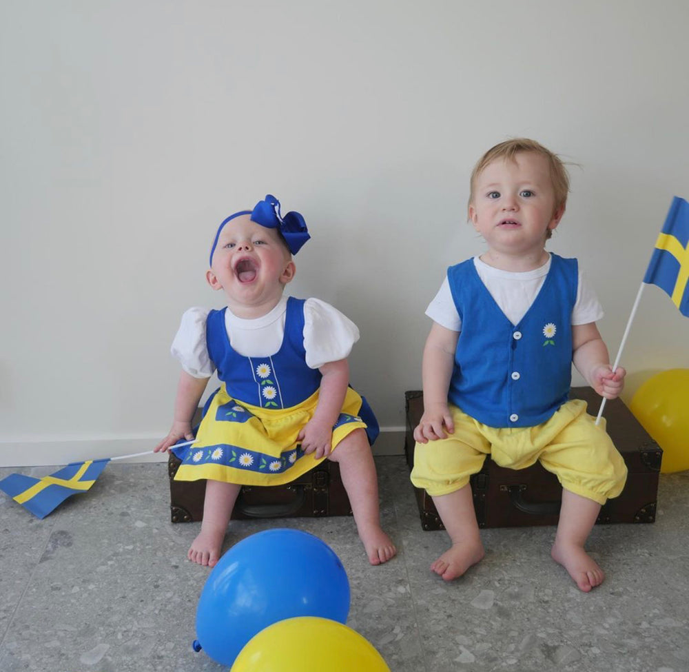 The Tiny Swede Boy is a charming tiny version of the traditional Swedish national costume, designed for the smallest members of the festivities. With its classic colors and sweet puff sleeves, it captures the spirit of Swedish heritage while remaining soft and comfortable for every summer night.